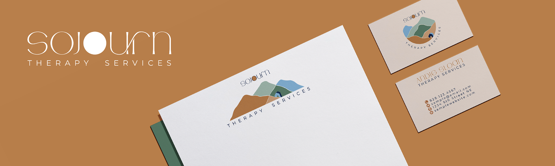 Design Brief: The logo for Sojourn Therapy Services invokes a feeling of serenity with the muted color palette and organic linework. The mountain range in the circular and horizontal logo overlaps and uses the given color palette in a color-block fashion. In this way, both logos can stand alone while also complementing each other staying true to the brand. These same shapes are used in the one-color logo while the cabin is created using negative space. The cabin nestled behind the first mountain stands out by using two blues that contrast with the warmer background colors. It represents the balance an individual can achieve by using Sojourn Therapy Services. The typeface for Sojourn is a modern typeface with flared strokes at the terminals of each letterform. U and R in Sojourn connect with a custom ligature giving the standalone wordmark more interest. The second O in Sojourn houses the sun rising over the mountain range signifying a new day and new beginnings. The filled-in O carries over into the one-color wordmark as well tying back into the original design.